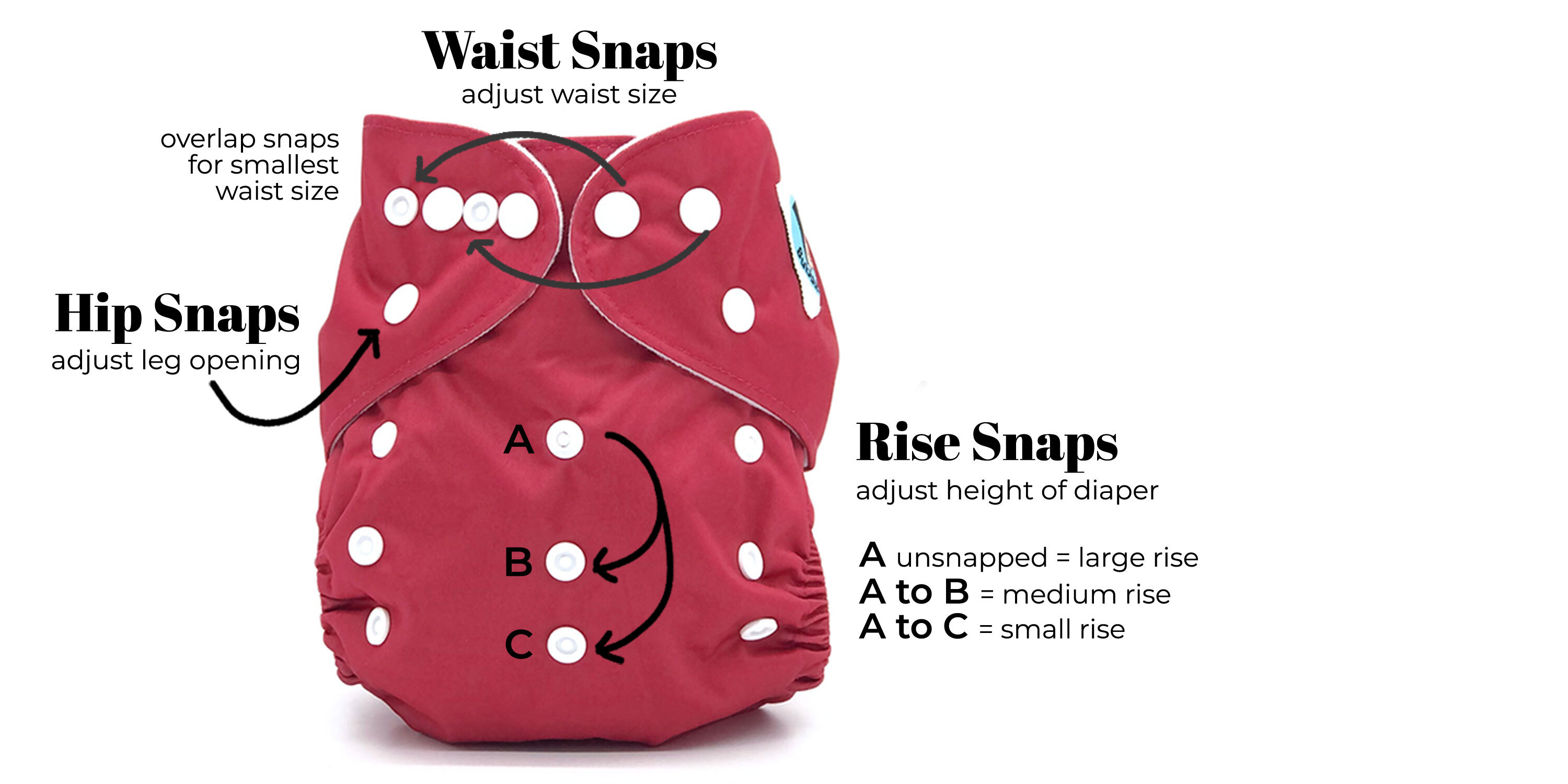 TO USE: Stuff the diaper insert into the diaper through the pocket opening. Make sure the insert lays flat and is not twisted or bunched. Fasten diaper around baby to form a snug yet comfortable fit. Experiment with snap settings to get the best fit at the waist, hip and rise. When the diaper is soiled, shake any loose solids into toilet. Remove insert from pocket. Store diaper and insert in dry pail until laundering.