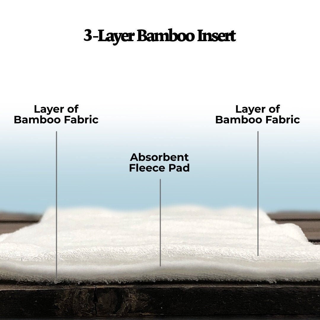 Six pack of 3-layer diaper inserts made with two outer layers of bamboo viscose fabric and an inner absorbent fleece pad. These 3-layer bamboo inserts are perfect for adding absorbency to a microfiber insert. You'll be surprised at how much these inserts can absorb without adding bulk. Also called a "doubler", it's a useful addition to nap or bedtime or for heavy wetters.
